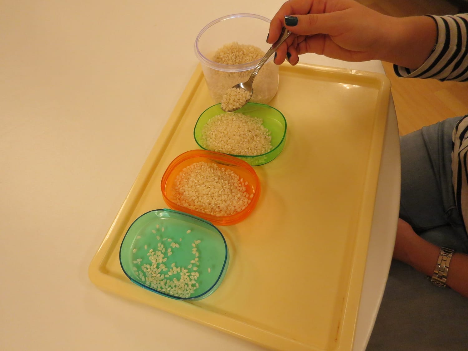 Favorece la atención, la motricidad fina y la organización. Se puede usar una bandeja con diferentes legumbres y varios recipientes pequeños.